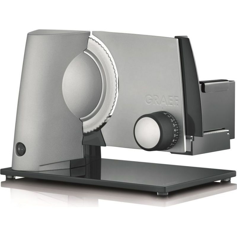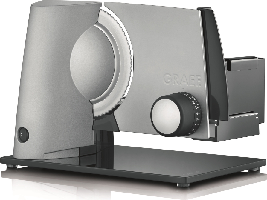 Elektrický kráječ GRAEF SKS 32000 zoubkovaný nerezový řezný kotouč o průměru 170 mm s bezpečnostním odnímatelným krytem zcela nová revoluční konstrukce kompaktní konstrukce, minimální nároky na místo vysoce stabilní provedení se skleněnou černou opěr