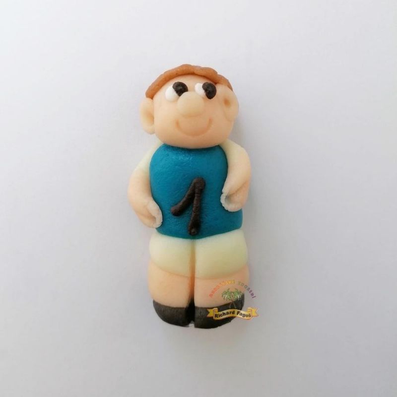 Ručně modelovaná 3D postavička v podobě fotbalisty s modrým dresem. Na výrobu byla použita modelovací kokosová hmota s příchutí a aroma sladkých mandlí. Lze s ní ozdobit dorty, rolády, zákusky a další.