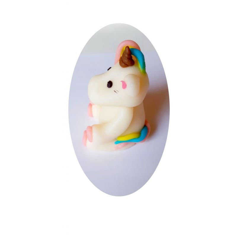 Ručně modelovaná 3D figurka jednorožce. Na výrobu byla použita modelovací kokosová hmota s příchutí a aroma sladkých mandlí. Lze s ní ozdobit dorty, rolády, zákusky a další.