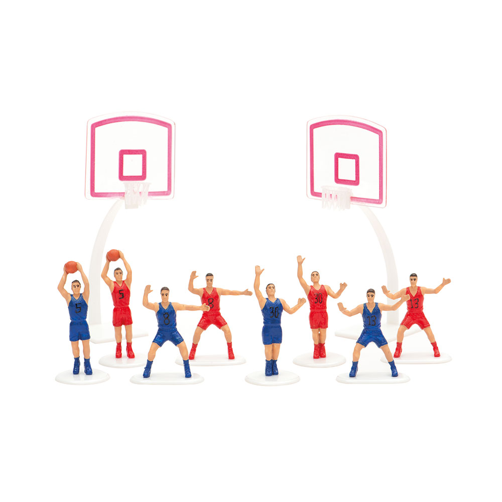 Figurky basketbalistů na dort jsou vyrobeny z odolného, zdravotně nezávadného plastu. V balení je 8 hráčů a dva koše. Pokud připravujete dort k narozeninám pro sportovce, inspirujte se a pořiďte si tento set. Rozměry: Hráči 5,71 – 6,98 cm - Koše 15,8 cm.