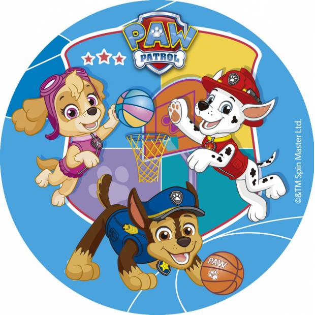 Fondánový papír s motivem Paw patrol basketbal. Průměr 15,5 cm.