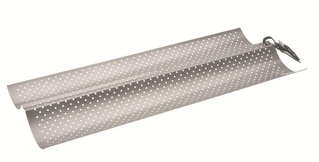 Speciální forma na bagety o rozměru 38 x 16,5 centimetrů na pečení dvou kusů baget. Kovový základ je potažený nepřilnavou vrstvou a upravený perforací tak, aby kůrka byla zlatavá a křupavá. Plech na bagety je možné použít v horkovzdušné plynové nebo elektrické troubě, snáší teploty až do 230° Celsia. Doporučujeme mýt ručně a ne v myčce nádobí. Výška 2,5cm. Doporučujeme formu na 4 bagety!