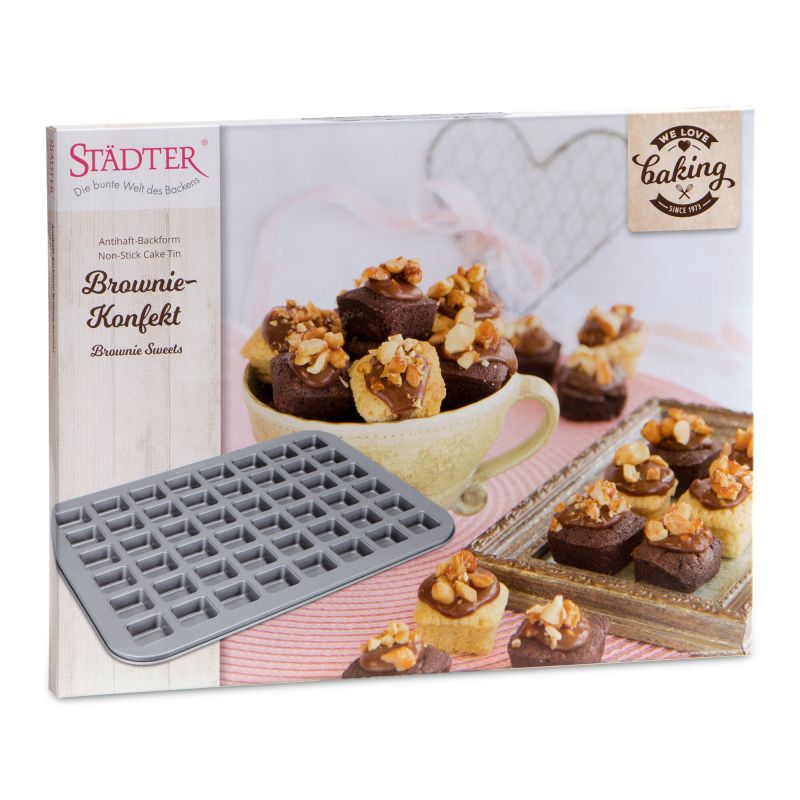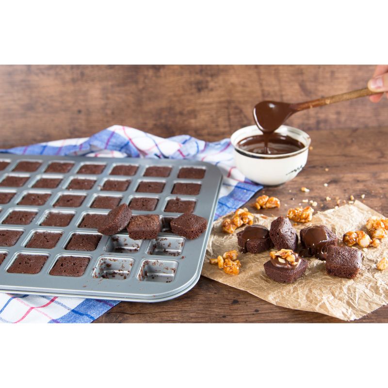 Pečicí forma na výrobu mini brownies. Tato forma na pečení se dá použít i na jiné druhy dortů a také velmi pěkná na výrobu čokolády. Forma je vyrobena z nerezové oceli a lze z ní vyrobit 1x 48 mini brownies o rozměrech 3,5x3,5x1,5cm.
