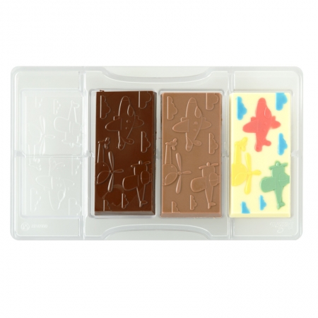 Polykarbonátová forma na čokoládu s motivem letadel.