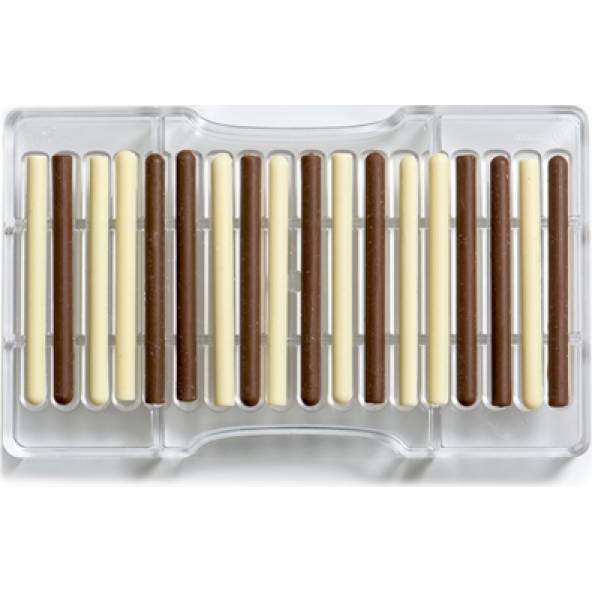 Polykarbonátová forma na čokoládu ve tvaru tyčinek. Forma se skládá z 18 tyčinek 0,8 x 8,5 cm. Tyto tyčinky se velmi dobře používají jako dekorace, například v lahodných pohárech, ale i na dorty. Rozměry této profesionální formy jsou 20x12x2,2cm.