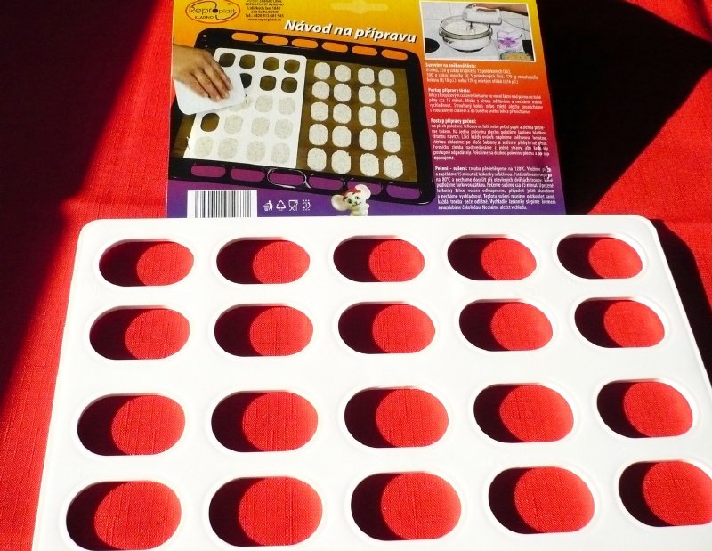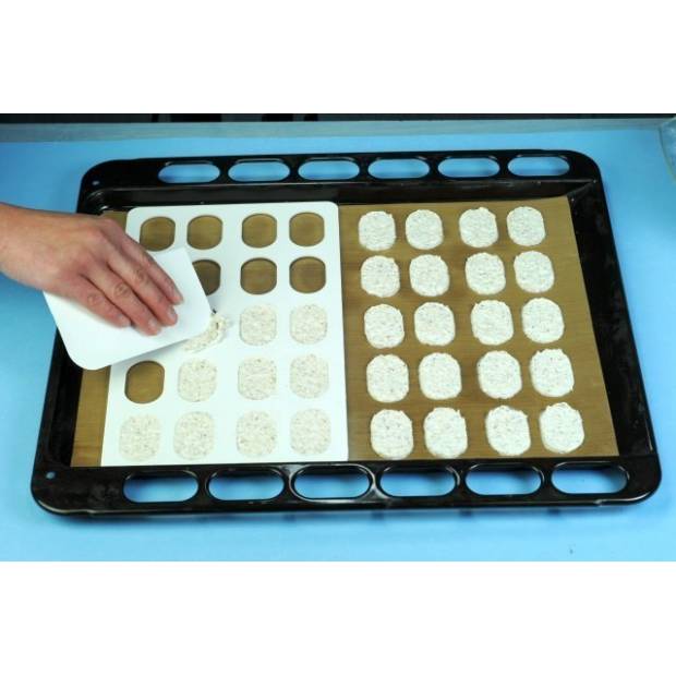 Šablonu na laskonky položte na plech vyložený pečícím papírem. Stěrkou po ní rozetřete hmotu na laskonky a šablonu opatrně odloupněte. Připravíte tak 20 stejně velkých laskonek. Rozměry šablony: 17,5 x 30 cm. Rozměr jedné laskonky: 4,9 x 3,1cmNechali jsme pro vás otestovat foodblogerem:Forma na laskonky je vyrobena z pevného plastu a je určena na 20 ks malých oválných kousků z bílkového sněhu, cukru a buď kokosu nebo jemně mletých ořechů nebo oříšků. U produktu je přiložen recept s podrobným postupem. Dle tohoto receptu se dá připravit cca 70 ks už slepených laskonek. Na plech položíme teflonovou fólii nebo papír na pečení, výrobce doporučuje ještě mírné potření tukem, ale myslím, že to nebude zapotřebí. Na jednu polovinu plechu položíme šablonu hladkou stranou nahoru a do oválků naneseme bílkovou hmotu. Povrch zarovnáme cukrářskou kartou a přebytečnou hmotu setřeme. Pak z jedné strany opatrně a pomalu šablonu nadzvedáváme, laskonky postupně odpadávají a zůstávají na plechu. Pak totéž zopakujeme na druhé straně plechu. Laskonky ze začátku pečeme 15 minut při 120°C a následně je dosušíme při teplotě 80°C při pootevřených dvířkách trouby. Zchladlé laskonky slepíme např. karamelovým nebo jiným krémem a můžeme je ještě dozdobit čokoládou. Se šablonou se pracuje naprosto skvěle a jednoduše. Výsledkem jsou laskonky stejné velikosti i tvaru, takže tato šablona Vás opravdu nezklame. V nabídce jsou i v jiných velikostech a v kulatém tvaru., tak má každý na výběr. M.F.