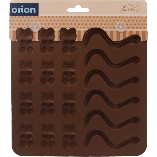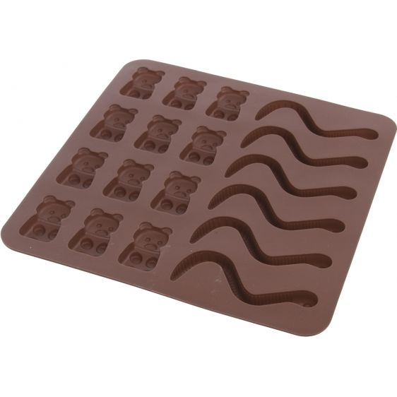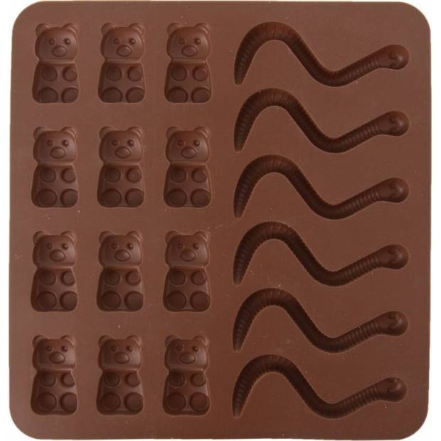 Silikonová forma Vám velmi jednoduše vytvoří želatinové medvídky a žížalky. Výborné domácí cukrovinky ocení především děti. Můžete vyzkoušet různé příchutě a barvy želatiny. Hnědá. Materiál: silikon. Snáší vysoké teploty (od -40 °C do +220 °C), nepřejímá chutě ani vůně z použitých potravin. Vhodná do myčky na nádobí. Rozměry: 19x19x1 cm, medvídek 3,5x2 cm, žížala d. 8 cm.