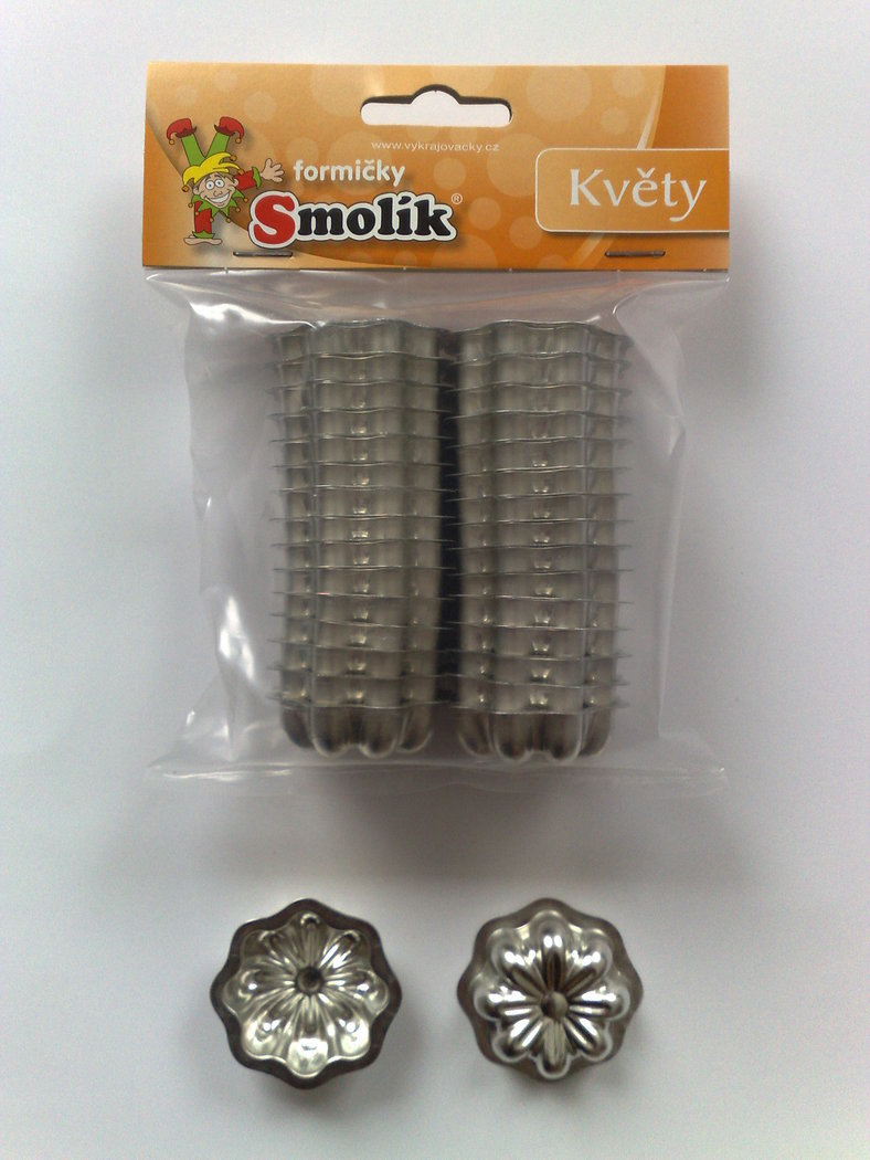 Vyklápěcí formičky na cukroví ve tvaru květů z pocínovaného plechu.
