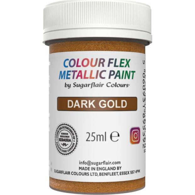 Metalická jedlá barva Sugarflair umožňuje snadnou přeměnu dortů a výtvorů díky husté konzistenci, příjemnému třpytu a univerzálním aplikacím. Promění obyčejné dorty v zářivé, lesklé kreace s oslnivým kovovým povrchem. Hustá konzistence zajišťuje velkorysou aplikaci, zanechává konzistentní krytí a luxusní finiš. S menším počtem tahů štětcem lze vytvářet velké oblasti, malé oblasti, složité vzory a odvážné a krásné zprávy od ruky nebo šablony Tento univerzální produkt je připraven k použití na cukrové pasty, květinové a modelovací pasty, marcipán, tvrdou čokoládu, tuhovou královskou polevu nebo máslový krém k vytvoření nekonečných dekorů a krásných dortů a pamlsků pro zvláštní příležitosti. Tato barva se snadno aplikuje přímo na cukrovou pastu, květinovou pastu, modelovací pastu, Royal Icing nebo jakýkoli jiný hladký, suchý povrch, jako je čokoláda nebo máslový krém, jakmile zatuhnete buď pomocí houby nebo štětce, nebo pro ještě přesnější návrhy lze snadno použít šablony.