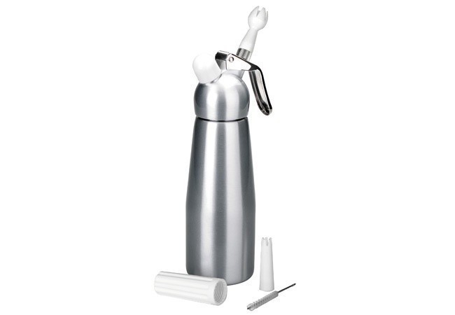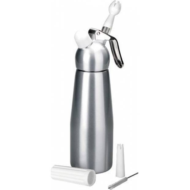 Moderní a praktický výrobek pro přípravu šlehačky. Kvalitní materiál - hliník je doplněna dvěma plastovými zdobítky, díky nimž můžete podávat vytvořenou šlehačku. Zároveň si tak získáte velice praktické a nápadité zdobítko. Šlehačková láhev určená pouze pro jednorázové bombičky.