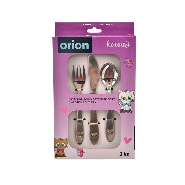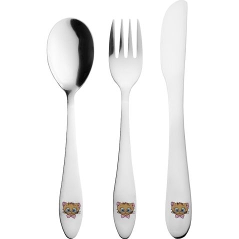 Příbory s motivem roztomilých kocourků s mašlí slouží pro nácvik správného stolování. Sada obsahuje lžíci délky 15,5 cm, vidličku 15 cm a nůž délky 17 cm. Svou velikostí a váhou jsou uzpůsobeny malým dětským ručkám.