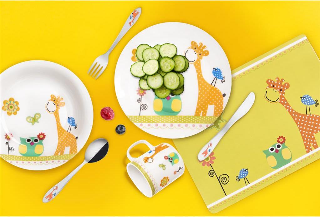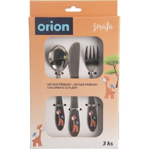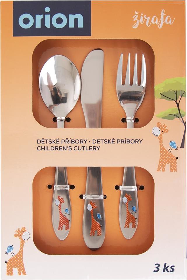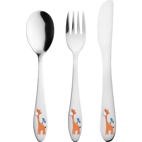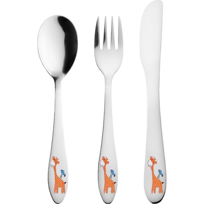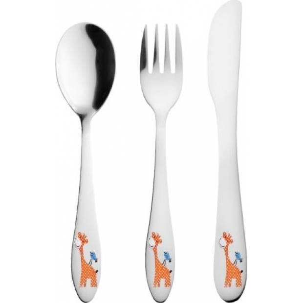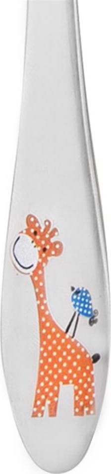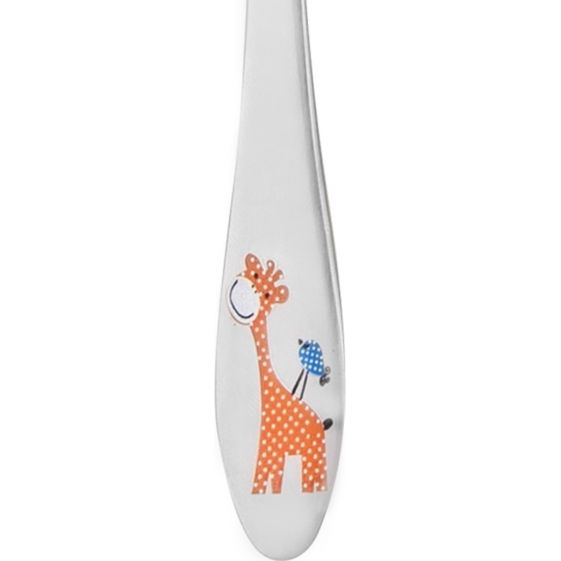 Dětský příbor s barevným dekorem žirafy. Obsahuje 3 ks - lžíci, vidličku a nůž. Materiál: kvalitní nerez. Tvar přizpůsobený dětem. Lze mýt v myčce na nádobí, ale nedoporučujeme, mohlo by dojít k porušení barevného dekoru, což později nemůže být důvodem reklamace. Rozměry: (délka/šířka) lžíce 15,5/3,5 cm, vidlička 15,5/2,5 cm, nůž 17/2 cm.