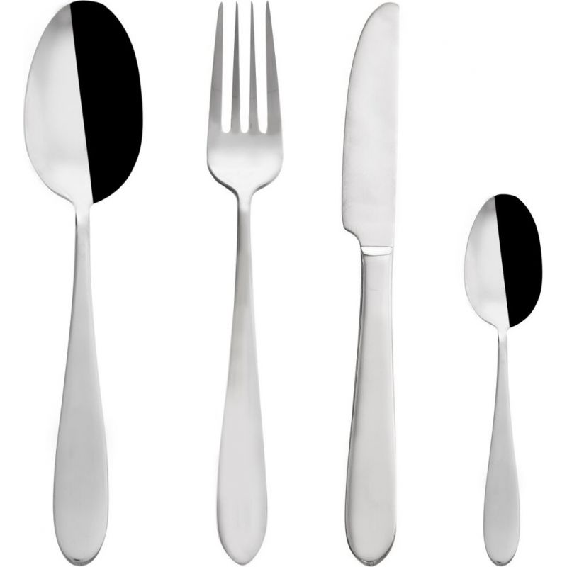 Lesklé nerezové příbory v jednoduchém, minimalistickém designu a elegantní zaoblenou spodní částí, která se příjemně drží v ruce