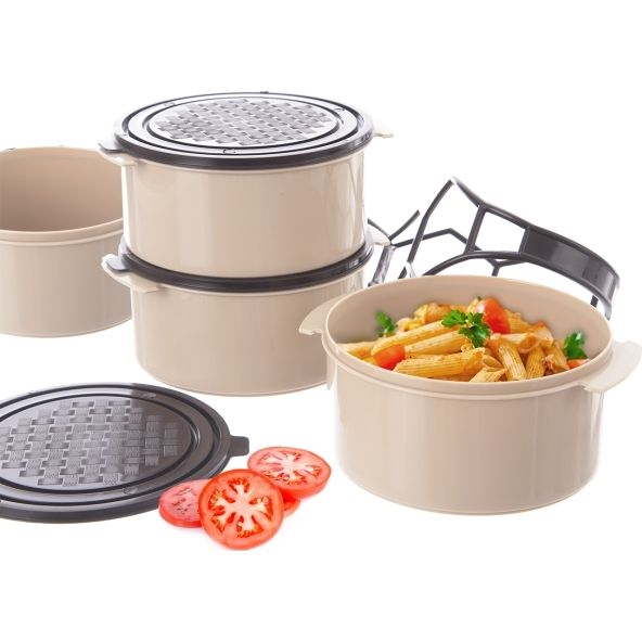 Plastový jídlonosič je určen pro přenášení potravin. 4 misky. Každá miska je opatřena víčkem, snadné sepnutí pomocí spony. Materiál: miska-plast PP, víčko a spona-plast PE. Barva dle aktuální nabídky. Rozměry: pr. 16,5 cm, v. 31 cm, objem 4x 1,5 l. Lze použít do myčky na nádobí, do chladničky i mrazničky, taktéž do MVT - bez víčka! Náhradní díly: víčko 120907, držák 181713.
