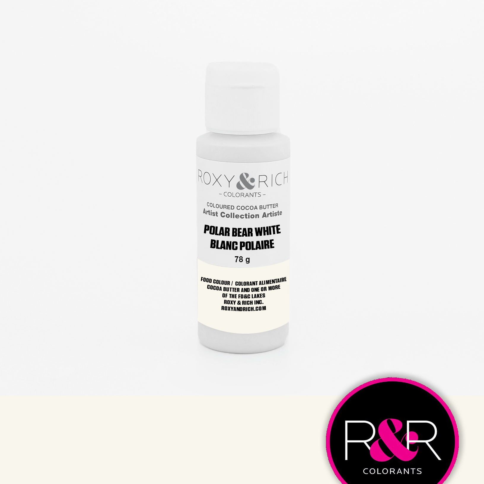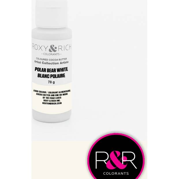 Krásná barva kakaového másla od Roxy & Rich, která mj. lze použít na čokolády, dorty a zákusky. Barva má matný povrch, v sérii více barev. Bezlepkový a bez laktózový produkt.Vhodné pro vegetariány a vegany. Tato bílá čokoládová barva je vyrobena z vápníku, aby se zabránilo použití E171. Protože k dosažení stejné bílé barvy jako při použití oxidu titaničitého (E171) je třeba použít více vápníku, znamená to, že barva je viskóznější. To znamená, že při použití v airbrush se barva musí více zahřát - zde je také velmi důležité, aby se airbrush pistole při používání dobře zahřála, protože jinak ve špičce velmi rychle tuhne. Barva se rozpustí přímo v nádobě v mikrovlnné troubě nebo ve vodní lázni a poté je tekutá - velmi snadné použití. Přebytečná barva v lahvičce ztuhne a lze ji použít znovu jindy. Zahřívejte vždy jen 10 sekund, protřepejte a znovu 10 sekund zahřívejte – pozor, ať se nepřipálí. Barva kakaového másla by se neměla temperovat. Lze nanášet štětcem, airbrushem nebo prsty. Opravdu produkt, který podporuje kreativitu!