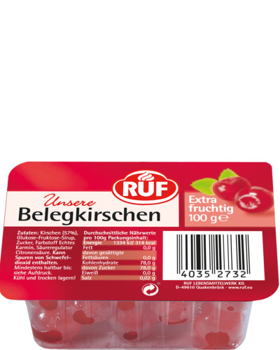 Třešně (54%), cukr, glukózo-fruktózový sirup, barvivo pravý karmín, okyselovač kyselina citrónová
