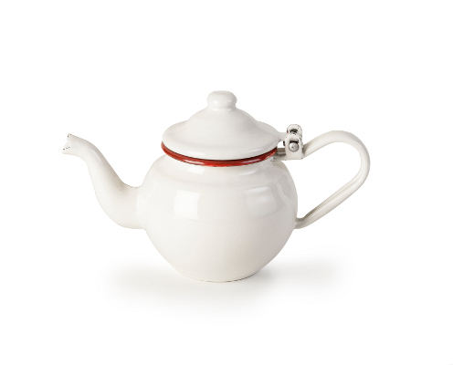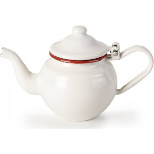 Čajník bílé barvy s červeným okrajem a smaltovaným povrchem.
