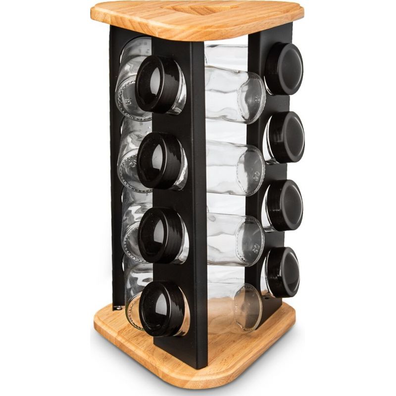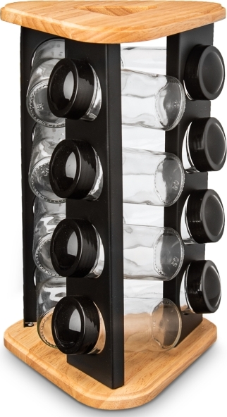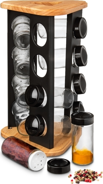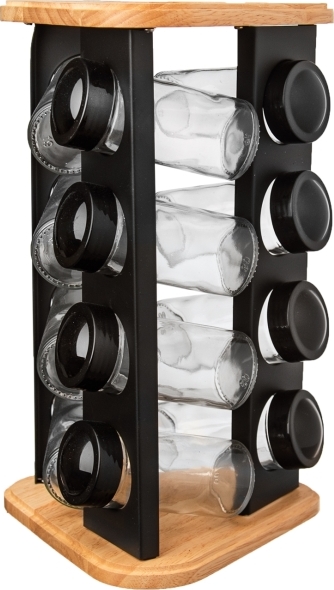 Designový otočný dřevěný stojan na trojúhelníkové základně rozměru 18x18x18 cm s černými nerezovými lištami s otvory, jehož součástí je 12 kusů skleněných kořenek průměru 4,5 cm a výšky 10 cm. Každá má plastové sypátko a černé víčko. Podle vloženého koření nebo dochucovadla tak můžete sypátko ponechat nebo jej odděláte a pohodlně nasypete a vysypete větší kousky, např. nové koření, hřebíček.