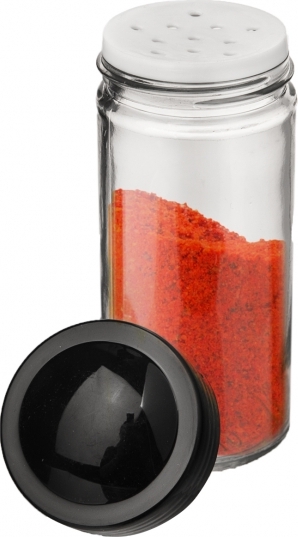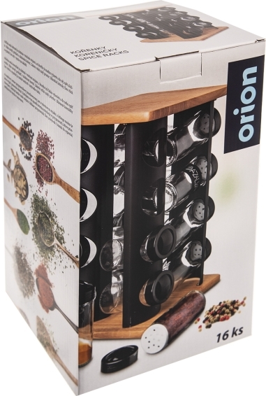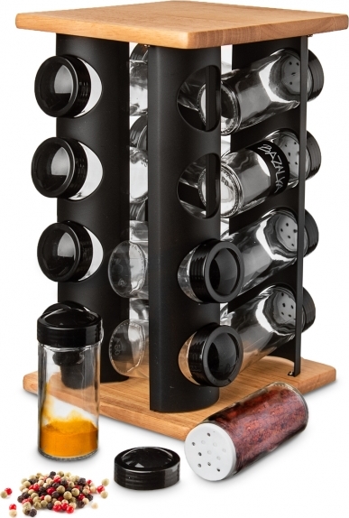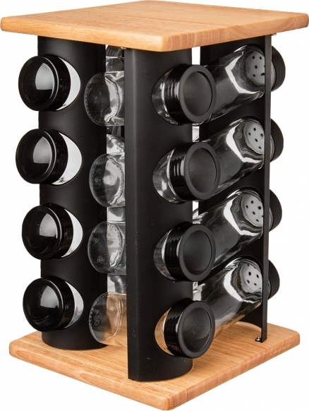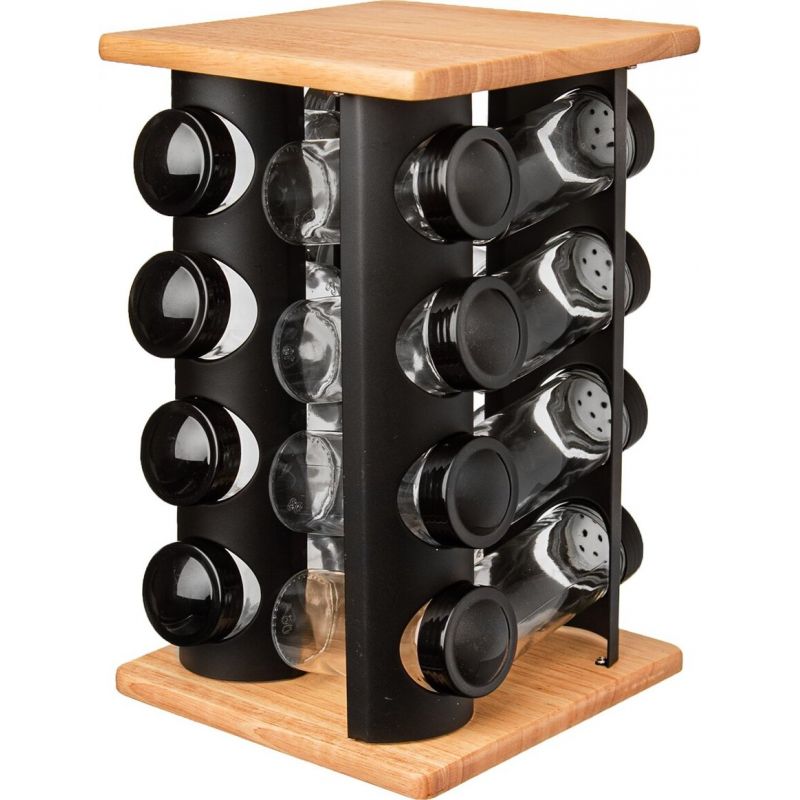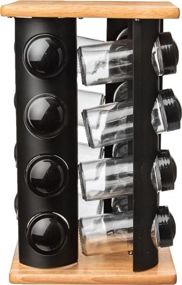 Designový otočný dřevěný stojan s černými nerezovými lištami s otvory, jehož součástí je 16 kusů skleněných kořenek průměru 4,5 cm a výšky 10 cm. Každá má plastové sypátko a černé víčko. Podle vloženého koření nebo dochucovadla tak můžete sypátko ponechat nebo jej odděláte a pohodlně nasypete a vysypete větší kousky, např. nové koření, hřebíček.