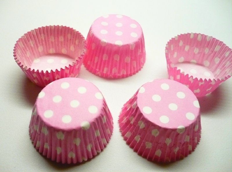 Sada padesáti košíčků z pergamenového papíru na pečení i servírování nepečeného cukroví. Košíčky mají růžovou barvu s bílým dekorem puntíků.