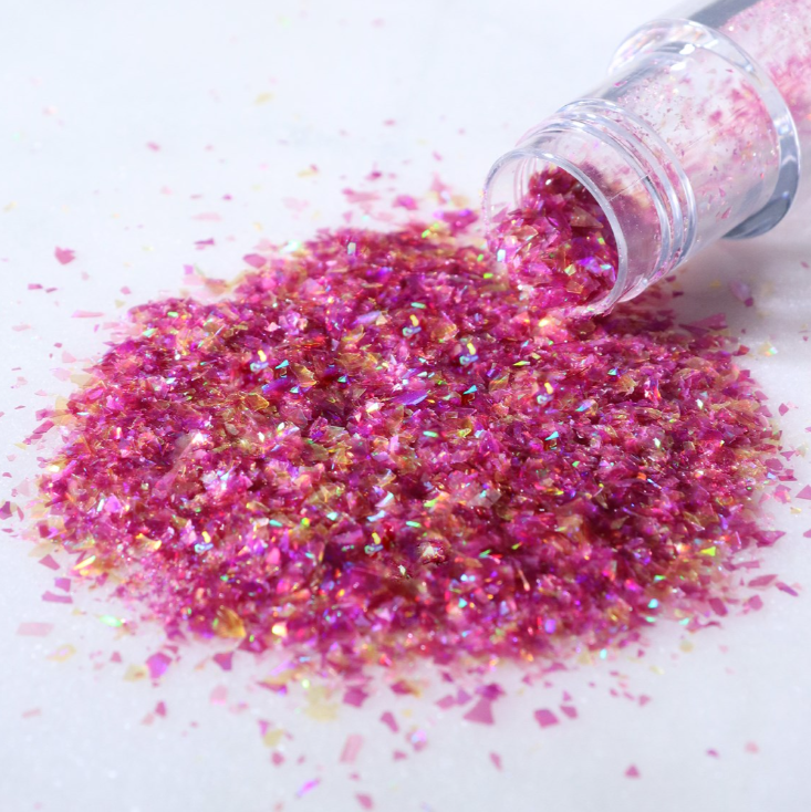 100% jedlé, veganské duhové třpytivé vločky vyrobené z rostlinných barviv. S efektem drahokamu. Používejte na suché povrchy, aby se zabránilo rozpuštění. Třpytivé vločky jsou ideální pro dodání oslnivého nádechu a zajistí, že vaše dezerty budou zářit jasně.