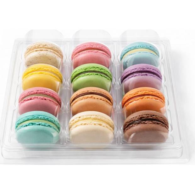 Průhledná plastová krabička na 12 makronek bezpečně ochrání tvoje dezerty a zároveň je nechá dokonale vyniknout.