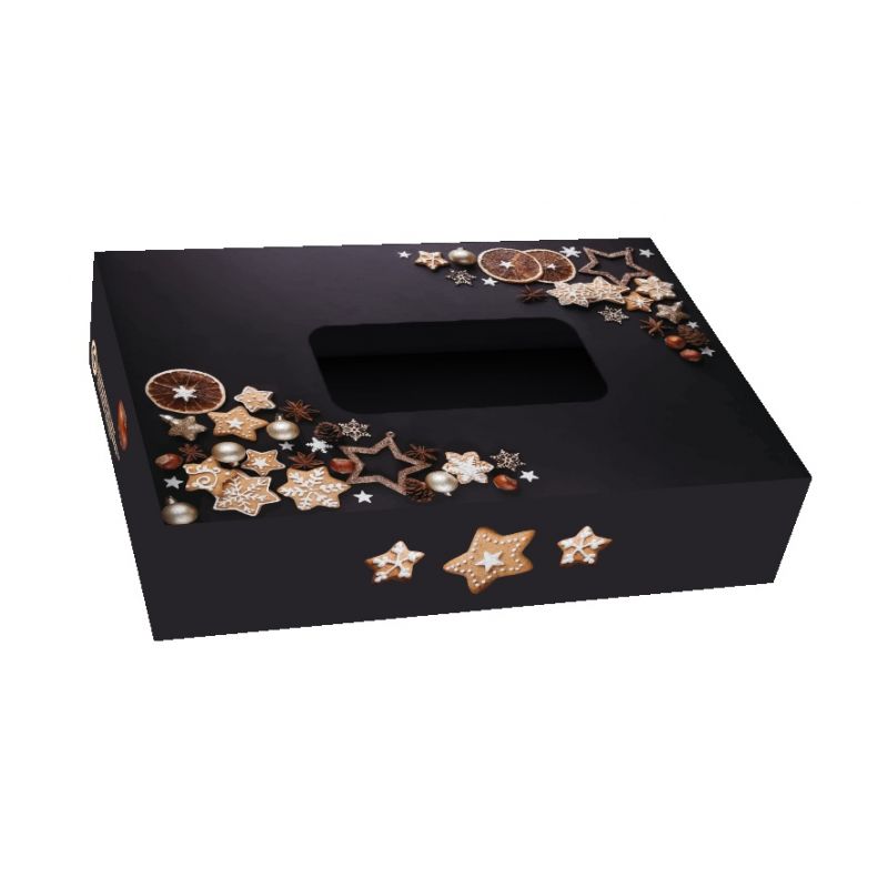 Krabička na vánoční cukroví s ozdobným potiskem. Perfektní řešení pro balení a přepravu svátečního pečiva pro vaše zákazníky. Obaly na dorty vyrobené z recyklovaného papíru, takže kromě originálního vzhledu zapadnete i do eko trendu. V současné době je velmi oblíbené pečivo s výrazným zdobením, které je však jemné a náchylné k poškození, zejména pokud je potřeba cukroví převážet. Proto je důležité vybavit se vhodně přizpůsobeným obalem, který vaše pečivo ochrání před případným poškozením. Protože známe specifika cukrářského průmyslu, dobře víme, že rozmanitost pečiva vyžaduje použití vhodných materiálů, ze kterých lze vytvořit odolné krabice na dorty. Obal je bez zápachu a měl příslušné certifikáty potvrzující jeho vhodnost pro potravinářské použití – jen tak si můžeme být jisti, že jsou krabičky na dort zcela bezpečné a nijak nenarušují chuť a vůni pečiva.