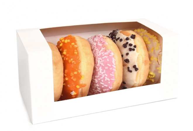 Jednobarevná krabička na donuty v bílém provedení. Uložíte do ní 5 ks donutů. Rozměry krabičky 185x95x90mm.
