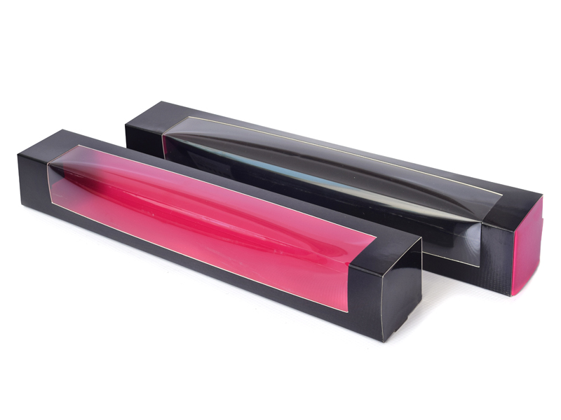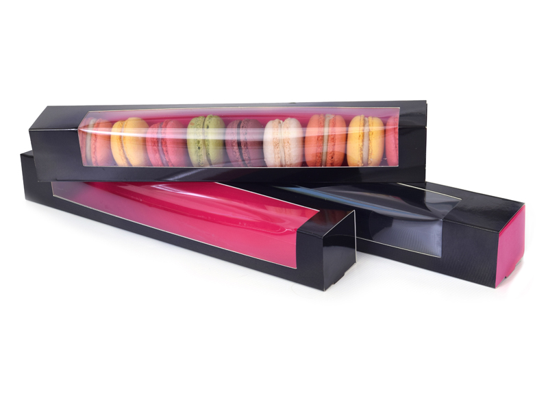 Dvoubarevná krabička na makronky je v černo-růžovém provedení. Uložíte do ní 6-9 makronek, je dodávána ve dvou částech. Rozměry 315x47x47mm mm.