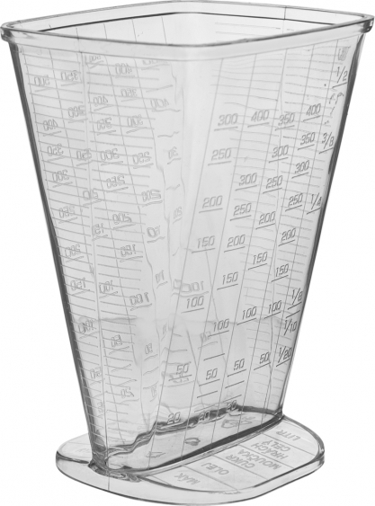Ty poslouží k odměření hmotnosti surovin v gramech nebo objemu tekutin v mililitrech. Účel každé stupnice je popsán v dolní části nádoby, např. mouky, cukru, oleje i rýže. Je vyrobená z kvalitního plastu. Její celkový objem je 0,5 l.