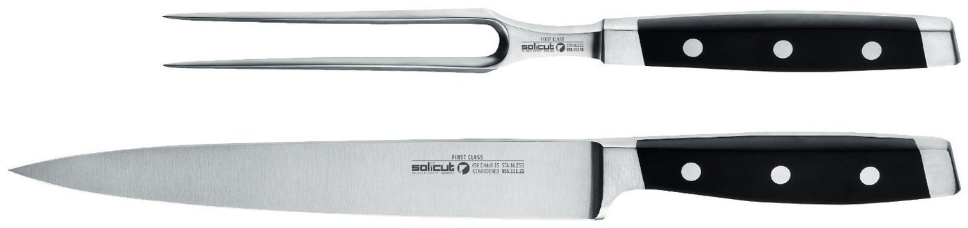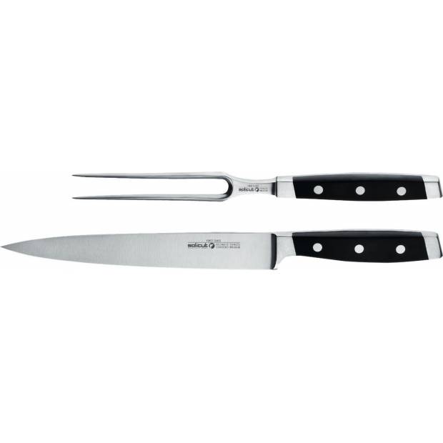 Čepel nože je vyrobena z kvalitní oceli, která zaručuje vysokou ostrost a odolnost proti otupění. Elegantní vidlička je vyrobena ze stejného materiálu. Součástí obou kuchyňských nástrojů je silikonová čepel, která se pohodlně drží. Dokonalé rozložení hmotnosti zaručuje pohodlnou a snadnou práci při krájení. Délka čepele nože je 21cm a délka přední části vidličky je 16cm. Nástroje ideální pro krájení masa.