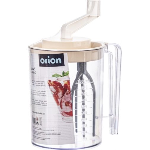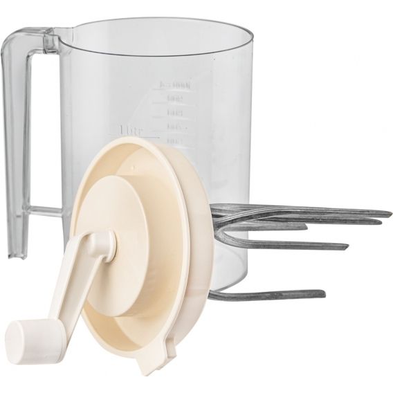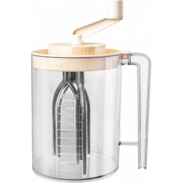 Šlehač kuchyňský ruční Vám pomůže našlehat smetanu, bílky do sněhové pěny, řídké těsto na moučníky... Využít můžete i samotnou nádobu s uchem a odměrkou. Materiál: plast, šlehací metly z eloxovaného hliníku. Snadná údržba. Není vhodný do myčky na nádobí. Rozměry: objem - odměrka 1 l, celkový objem nádoby 1,5 l, pr. 11,5 cm, v. 22 cm.