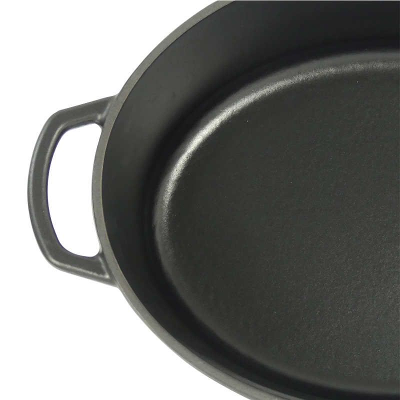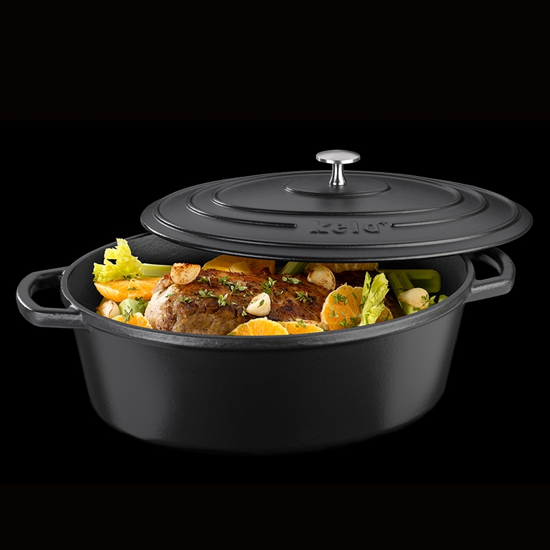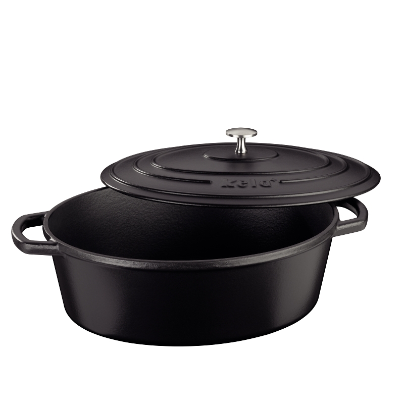 Litinový kastrol Calido Oval, 33 x 26 x 12 cm, pojme 6,0 l, matný povrch, v černé barvě s poklicí. Lze použít do 300°C. Celková délka včetně rukojetí: 42 cm. plocha dna 27,5 x 19,5 cm.