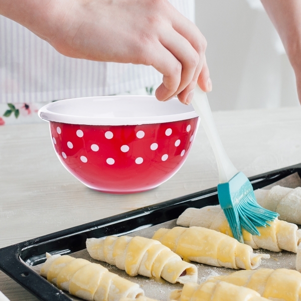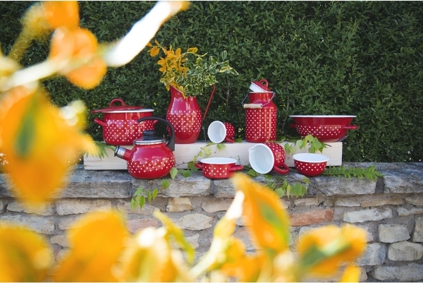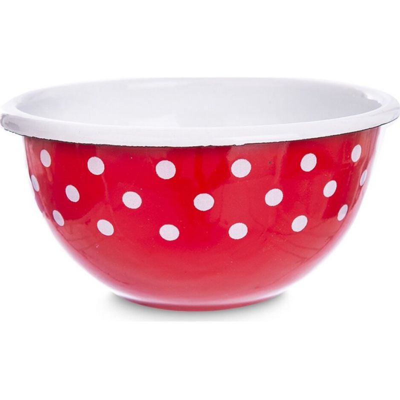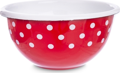 Součástí retro kolekce smaltovaného nádobí TEČKA je i tato červená miska s bílými puntíky a bílým okrajem. Má průměr 12 cm a velmi všestranné využití. Od servírování oříšků nebo sušeného ovoce k menší misce snídaňové kaše nebo pomocné nádobě při vaření.