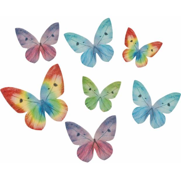 Barevní motýlci jsou vyrobení z jedlého papíru a připravení pro okamžitou dekoraci vašich cukrářských