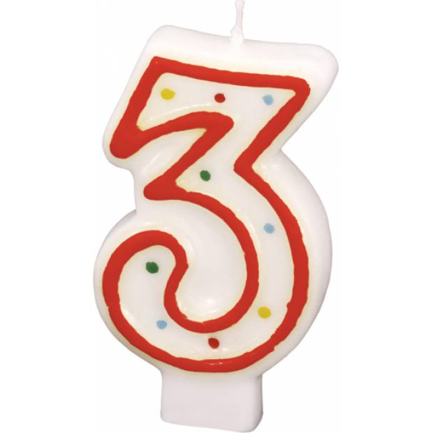 Narozeninová svíčka ve tvaru číslice 3 s puntíky. Výška 7,3 cm.