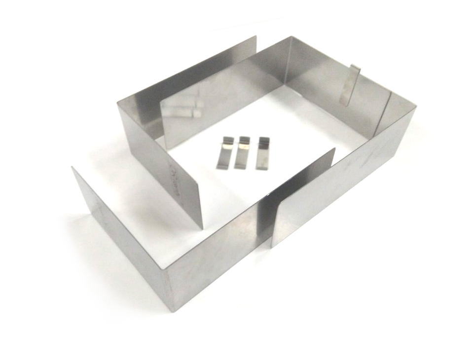 Hranatá nastavitelná forma na dor střední velikosti. Forma je 8 cm vysoká. Vyrobeno z odolné a deformační nerezové oceli s certifikátem. Sada obsahuje dvě montážní spony. Cukrářská kruhová forma je alternativou k tradičním plechům na pečení. Naproti tomu je mnohem funkčnější, protože ji lze libovolně upravovat. Použití ráfku mimo jiné usnadňuje žádné dno a dvě spony připevněné k sadě, které slouží k upevnění jejích stran. Postačí položit papír na pečení nebo pergamen na jakýkoli povrch, postavit na něj nastavitelný okraj a poté do něj nanést hmotu. Po vyjmutí z trouby si pečivo udrží svůj dokonalý tvar. Navíc je jednodušší rozdělit jej na porce než sladkosti na klasickém plechu na pečení.