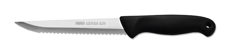Praktický kuchyňský nůž na krájení zeleniny a masa s vlnitou čepelí. Čepel je dlouhá 15 cm. Vyrobená z velmi odolné nerezové oceli. Plastová rukojeť usnadní manipulaci s nožem. Je možné jej mýt v myčce nádobí.