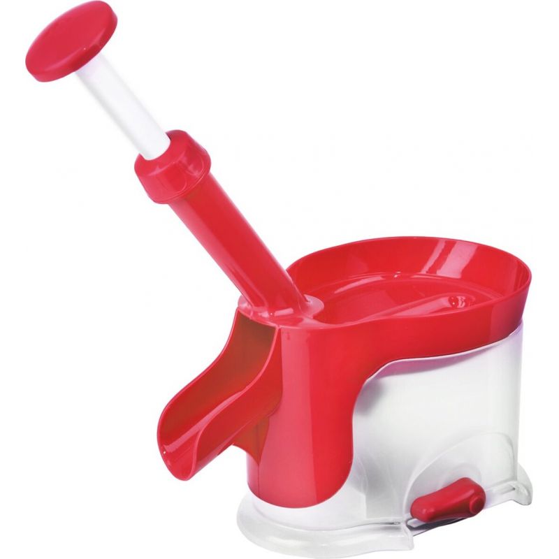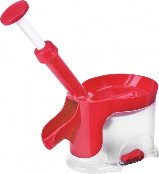 Odpeckovač třešní a višní je snadno vypeckuje. Ovoce stačí postupně vsypat do velké horní násypky, pomocí pružinového systému v rukojeti je pecka protlačena do zásobníku. Odpeckované ovoce pak vypadne mimo strojek do jakékoliv připravené nádoby.