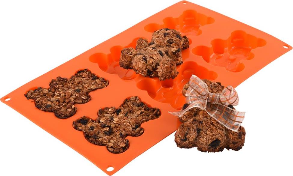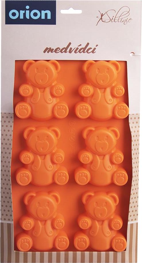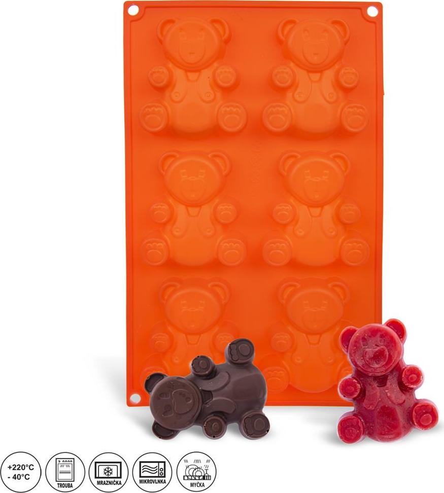 Forma na pečení Vám pomůže vytvořit medvídky, kterými potěšíte především děti. Můžete je upéci z piškotového nebo litého těsta, naplnit čokoládou, marmeládou, ozdobit polevou, můžete v nich zmrazit ovocnou dřeň... Ve formě připravíte 6 ks medvídků. Forma je lehká, skladná, nepřilnavá, těsto se v ní nepřipéká, nepohlcuje pachy z potravin, je odolná teplotám od -40 °C do +220 °C. Snadno se udržuje, lze ji mýt v myčce na nádobí. Forma je vhodná do plynové, elektrické i horkovzdušné trouby, do chladničky i mrazničky. Materiál: silikon Rozměr formy: 31 x 18 x 2 cm Rozměr medvídka: 8,5 x 7 cm
