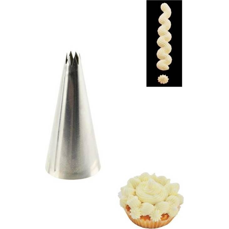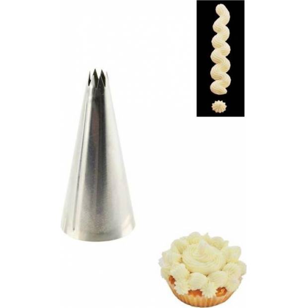 Špička zdobicí hvězda - 8 cípů jemná. Využijete ji na zdobení dortů a zákusků krémem. Materiál: nerez Průměr: 0,8 cm Výška: 5,5 cm
