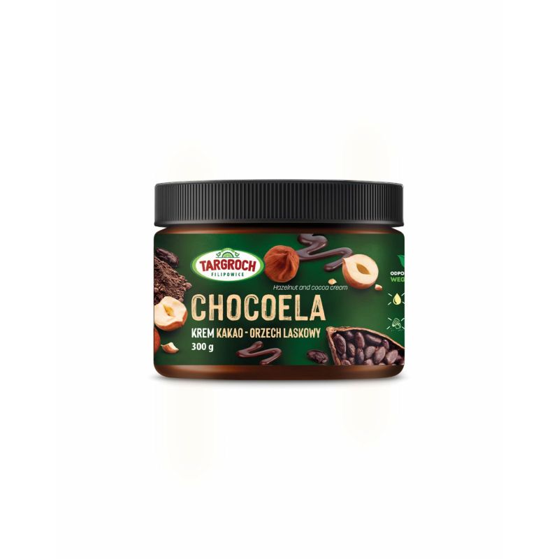 Krém ChocoNUTela je novinkou od společnosti Targroch. Krém je kombinací lískových ořechů s kakaem a přídavkem maltitolu. Produkt neobsahuje palmový olej ani cukr. Tento krém je ideální do sendvičů, koláčů, palačinek, smažených placek, dezertů a různých svačin. Je to také skvělý nápad na sladkou snídani pro děti. Složení: sladidlo: maltitol, bambucký olej, lískové ořechy 21 %, sušené odstředěné mléko, kakao se sníženým obsahem tuku 6,4 %, demineralizovaný syrovátkový prášek (z mléka), kakaová hmota, aromata, emulgátor: lecitin (ze sóji) Nutriční hodnota výrobku ve 100 g Energetická hodnota je 2125 kJ / 508 kcal Tuky 40 g nasycené mastné kyseliny 9,6 g Sacharidy 45 g z toho cukry 8 g Vláknina 4,3 g Bílkoviny 7,3 g Sůl 0,08 g Alergeny: ořechy, mléko, sója Skladování: Výrobek lze skladovat při pokojové teplotě. Spotřebujte do 1 měsíce po otevření. Olej na povrchu je přirozený jev. Vhodné pro vegetariány. Hmotnost netto: 300 g