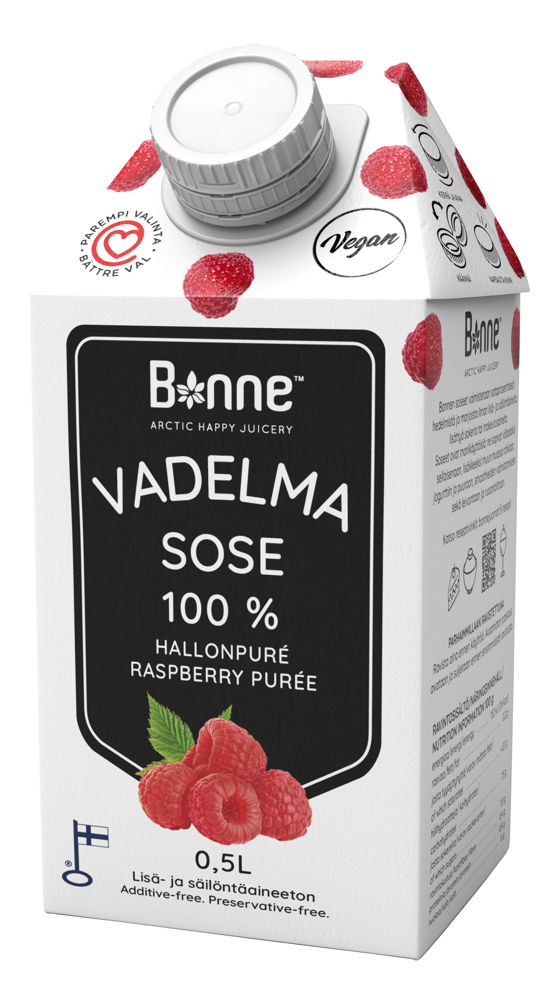 Malinové pyré Bonne má 100% podíl ovoce. Výrobek je neslazený, bez přísad a konzervantů a neobsahuje přidaný cukr. Pyré lze použít k výrobě: zmrzliny, smoothies, lassi, koktejlů, džusů, koktejlů, sorbetů a dortů. Produkt má dokonale hladkou konzistenci - bez slupek a semínek. Bonne Premium je jedinou značkou v této kategorii. Ovocné pyré Bonne Premium je připraveno k jídlu jako skvělá svačina nebo se dá přidat do kaše nebo jogurtu.Naše pyré vyrábíme a balíme ve finské Lohja. 100 % malina.