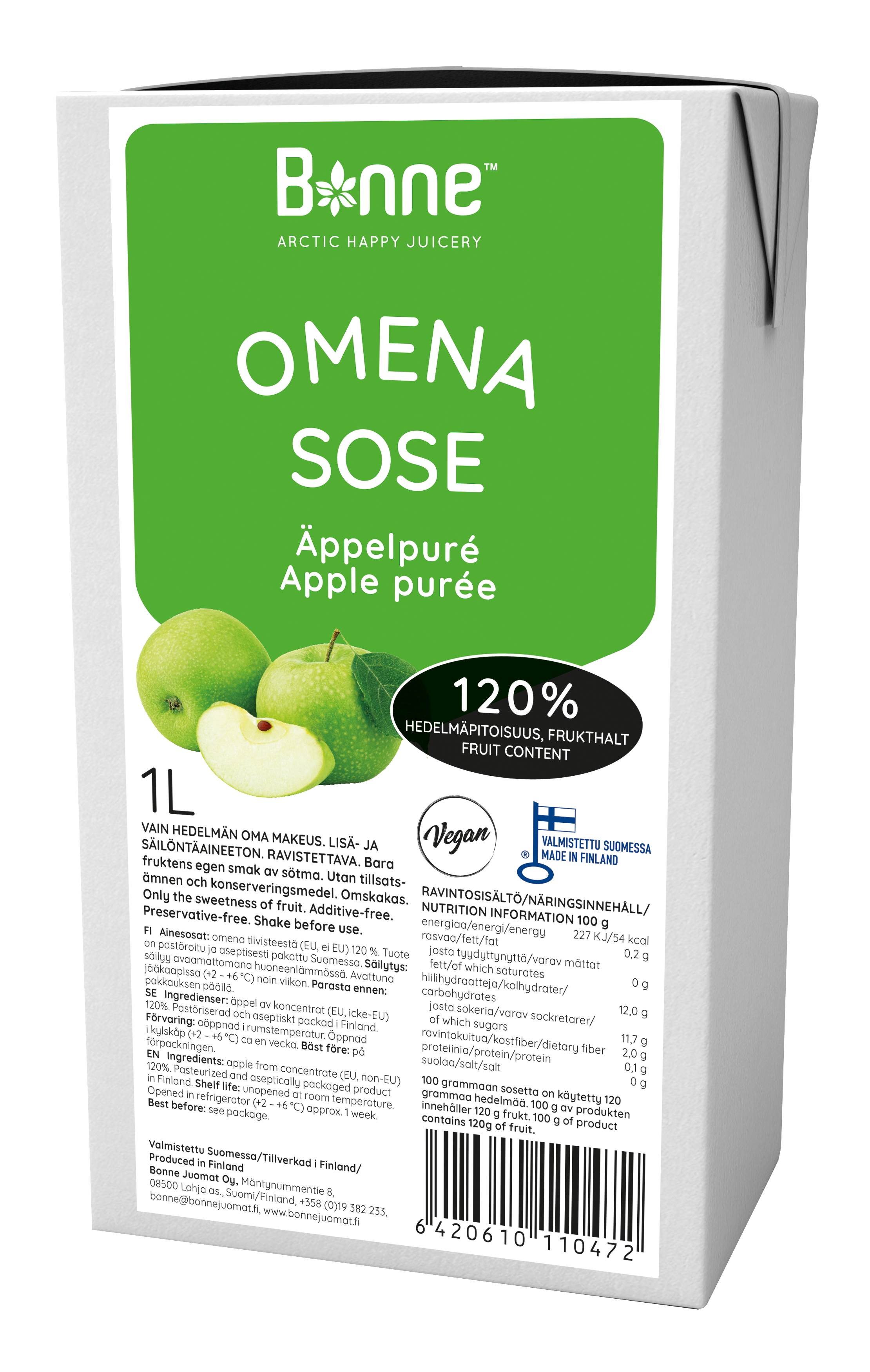 Jablečné pyré Bonne má 100% podíl ovoce. Výrobek je neslazený, bez přísad a konzervantů a neobsahuje přidaný cukr. Pyré lze použít k výrobě: zmrzliny, smoothies, lassi, koktejlů, džusů, koktejlů, sorbetů a dortů. Produkt má dokonale hladkou konzistenci - bez slupek a semínek. Bonne Premium je jedinou značkou v této kategorii. Ovocné pyré Bonne Premium je připraveno k jídlu jako skvělá svačina nebo se dá přidat do kaše nebo jogurtu.Naše pyré vyrábíme a balíme ve finské Lohja. Doba použitelnosti Neotevřené při pokojové teplotě do data minimální trvanlivosti, otevřeno v chladničce cca. 1 týden.