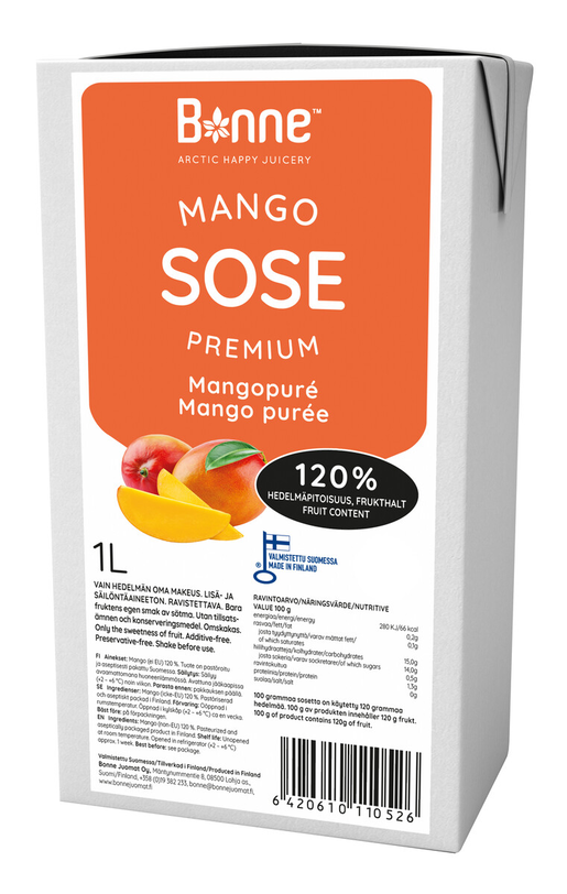 Vydejte se s námi na exotickou kulinářskou cestu. Od této chvíle bude skládání nových receptů asijské kuchyně jednoduché a příjemné. Už nemusíte hledat zralé ovoce, abyste z něj udělali lahodný pokrm. Stačí sáhnout po našem pyré, které je z exotického manga. Bez přidaného cukru, obsahuje pouze cukry přirozeně se vyskytující v ovoci. Čisté ovocné pyré je 100% bez cukru jsou lahodné a především zdravé. Neobsahuje žádné konzervační látky ani sladidla. Je vyrobeno ze zralého a vybraného ovoce. Ovocné pyré Bonne jsou určeny také dětem, protože neobsahují žádné přísady, jako jsou aromata, kyselina citronová, cukr nebo glukózový sirup. Naše ovocné pyré jsou skvělým řešením pro rychlou přípravu výživných SMOOTHIES, KOKTEJLŮ, DEZERTŮ, DORTŮ, OMÁČEK nebo POLÉVEK. Produkt má dokonale hladkou konzistenci - bez slupek a semínek. Bonne Premium je jedinou značkou v této kategorii. Ovocné pyré Bonne Premium je připraveno k jídlu jako skvělá svačina nebo se dá přidat do kaše nebo jogurtu.Naše pyré vyrábíme a balíme ve finské Lohja. 100 % mango. Výživová hodnota/ 100 g Energie 274 kJ (65 kcal) Tuk 0,3 g z toho nasycené mastné kyseliny <0,1 g Sacharidy 14,0 g z toho cukry 13,5 g Vláknina 0,8 g Bílkoviny 0,5 g Sůl 0 g Doba použitelnosti Neotevřené při pokojové teplotě do data minimální trvanlivosti, otevřeno v chladničce cca. 1 týden.