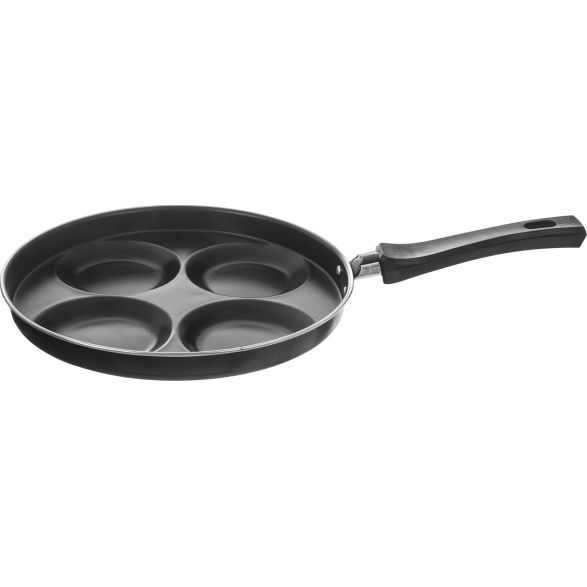 Pánev na volská oka s nepřilnavým povrchem z řady ekonomy. Volská oka nebo lívanečky připravíte klasicky i na minimálním množství tuku. Rukojeť díky materiálu i tvaru skvěle padne do ruky, je opatřena očkem pro možnost zavěšení. Materiál: kov s nepřilnavým povrchem, bakelit. Vhodná na všechny typy spotřebičů kromě indukce. Nutné pánev zahřívat velmi postupně a nepřehřívat ji. Nevylučuje žádné toxické výpary, je šetrná k životnímu prostředí a především ke zdravému vaření. Rozměry: průměr 25 cm, výška 3 cm, tl. 1 mm, pr. jedné sekce 8 cm.