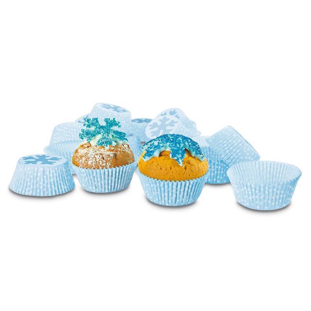 "Papírové pečicí formičky - košíčky, vzor sněhová vločka. Papírové formičky jsou vhodné na pečení muffinů a cupcakes. Košíčky vždy naplňte těstem jen do 2/3, při pečení těsto zvětší svůj objem.