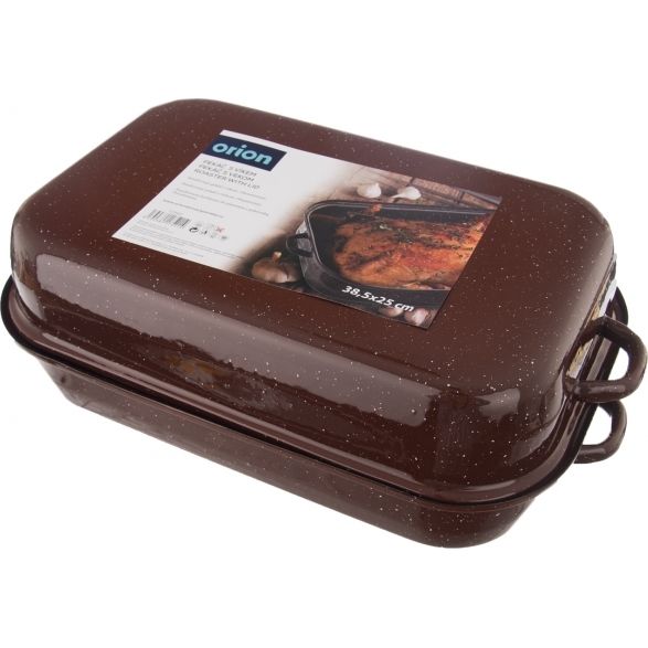 Smaltovaný pekáč s víkem o rozměrech 38 x 38 cm.
