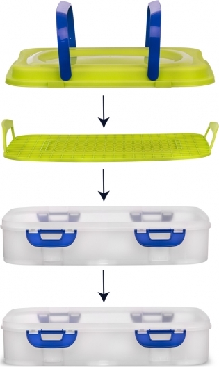 Má dvě samostatná patra, která se k sobě připevňují pomocí několika klipů. Sestava obsahuje plastovou mřížku s uchy, která ulehčují vyjímání obsahu. Dále je součástí plastové víko se dvěma držadly, které umožňují pohodlné nošení boxu.