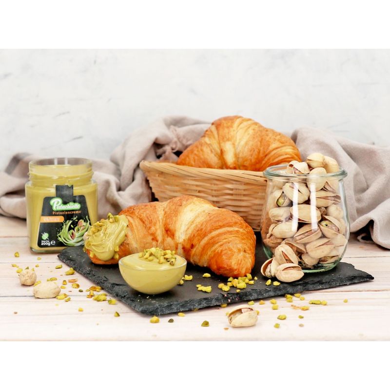 Chuť této 100% pistáciové pasty mluví sama za sebe. Její použití je rozmanité: je výbornou přísadou do dezertů, koktejlů, omáček, krémových polévek, zmrzlin, snídaňových müsli, cereálií a cereálních vloček, ale skvěle dochutí i různé omáčky k masu a těstovinám, ale dá se jednoduše konzumovat k jakémukoli jídlu lžičkou nebo dvěma nebo namazat na chleba či mazanec. Je ideální pro výrobu slavné dubajské čokolády. Složení: pistácie 40?%, cukr, rostlinné oleje a tuky (palmojádrový, slunečnicový), odstředěné MLÉČNÉ sušené mléko, syrovátkový prášek (MLÉKO), laktóza (MLÉKO), emulgátor: E 322 (sójový lecitin); přírodní aroma, barvivo: E 141 (měďnaté komplexy chlorofylů a chlorofylinů). Může obsahovat stopy OŘECHŮ a SÓJI. Nutriční hodnoty ve 100 g: energie 2257 kJ/541 kcal, tuky 34 g (z toho nasycené 15 g), sacharidy 51 g (z toho cukry 44 g), vláknina 3,7 g, bílkoviny 6 g, sůl 0,16 g"